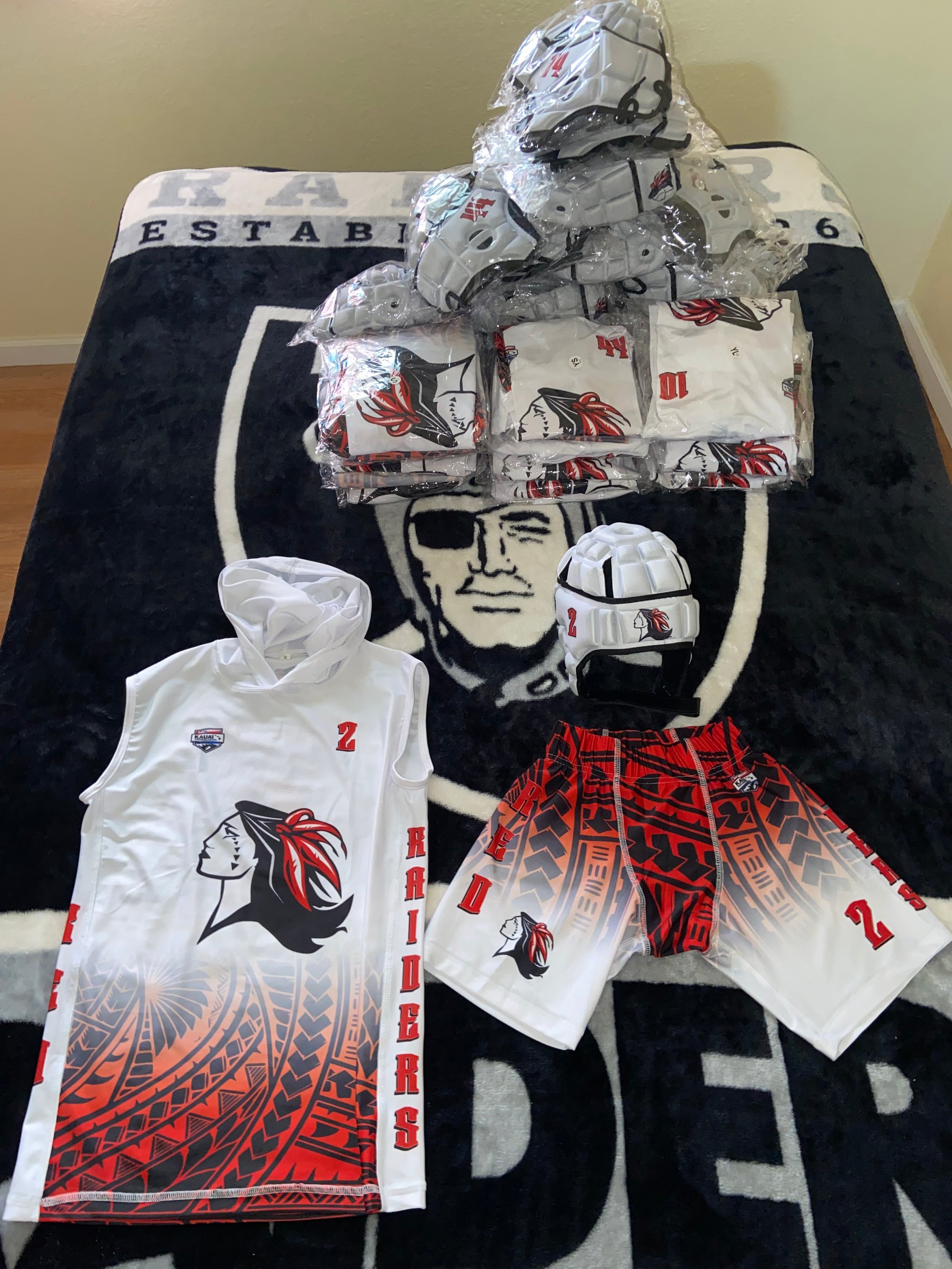 Take your team to the next level, We can make the helmet, uniform, and flags all matching. We try our best to get it done right away. $50 for uniform top, bottom set, or add as full set with uniform, helmet, and flags for $100.